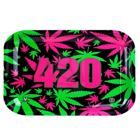 Bandeja de metal en colores negro y rosa con diseño 420, tamaño práctico y estilizado para tu espacio de fumador.