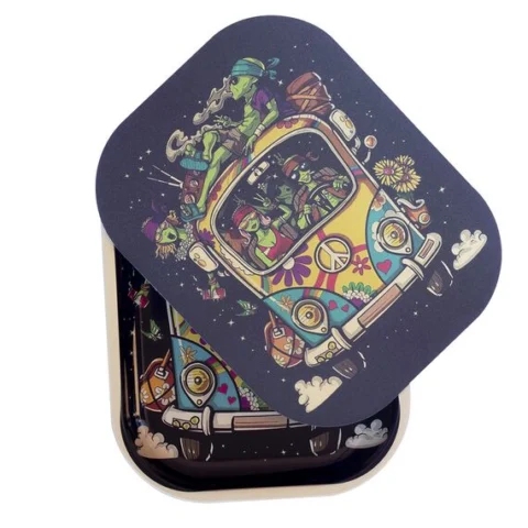 Si disfrutas preparando tus cigarros, una bandeja específica es indispensable. Esta te permitirá tener todo organizado y al alcance (papel, mechero, boquillas) y evitará ensuciar tus muebles. Nuestras bandejas de metal con tapa mantienen el contenido discreto y protegido de miradas curiosas. Este modelo presenta un diseño de autobús sesentero, con un estilo muy «fumeta».
