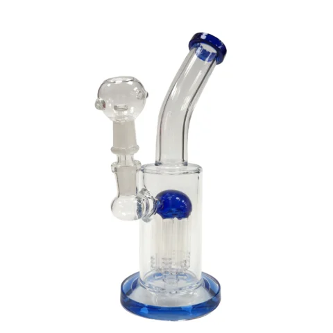 Bong de cristal de 21 cm con detalles azules y diseño inspirado en Medusa, combina arte y funcionalidad para un fumado excepcional.