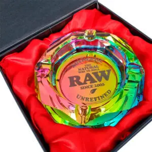 Cenicero de cristal con diseño RAW y acabado en arcoíris. Elegante y funcional.