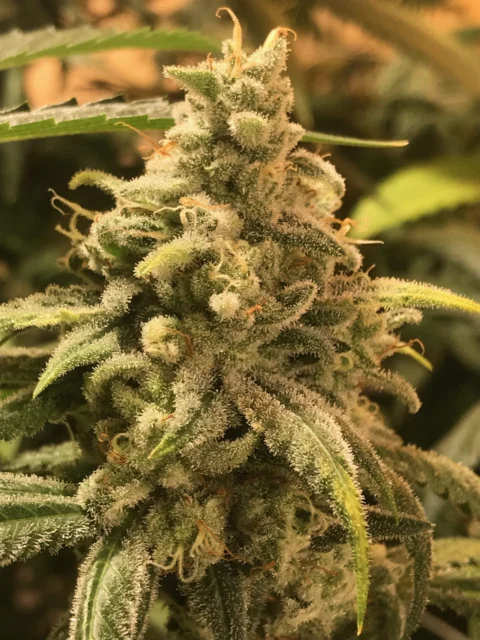 La textura pegajosa y el brillo de sus flores reflejan un perfil resinero de alto nivel, fiel a su herencia kush.