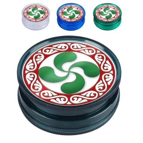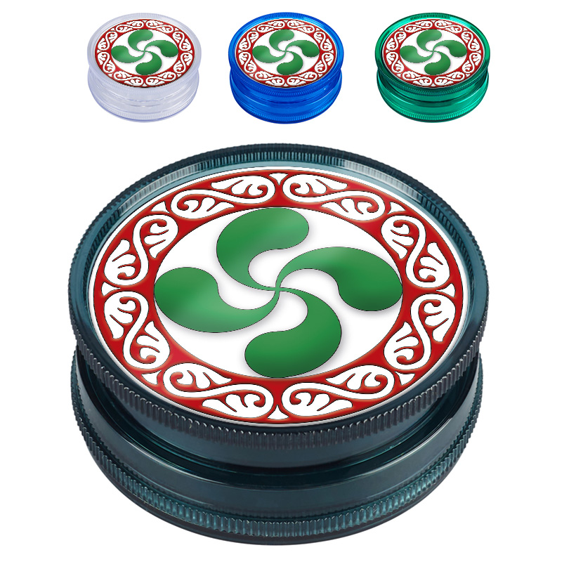 Grinder de 60 mm con diseño de Lauburu en colores variados, combinando funcionalidad con un toque cultural único.