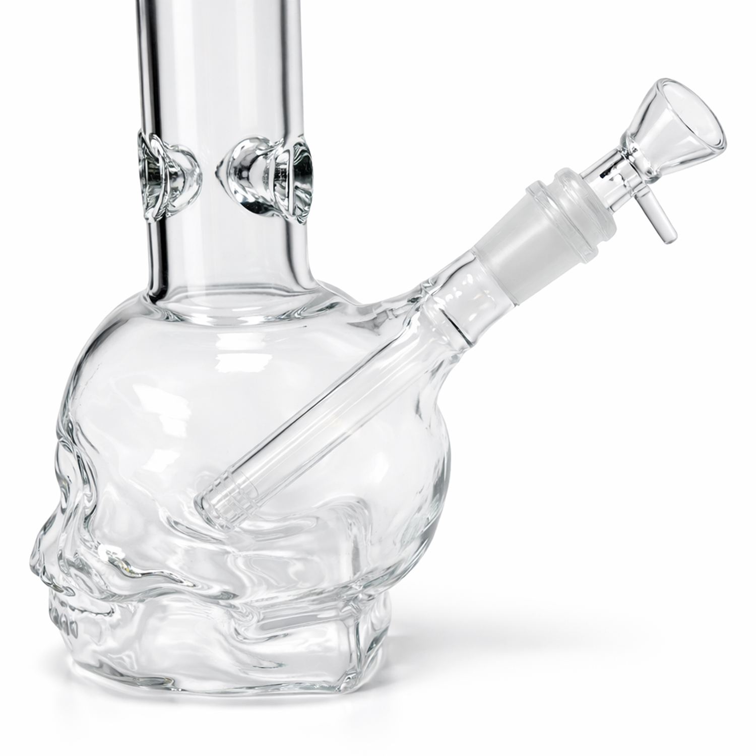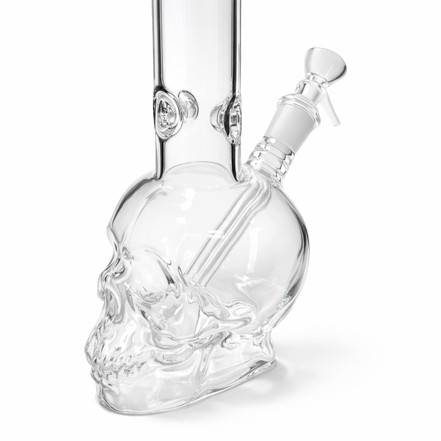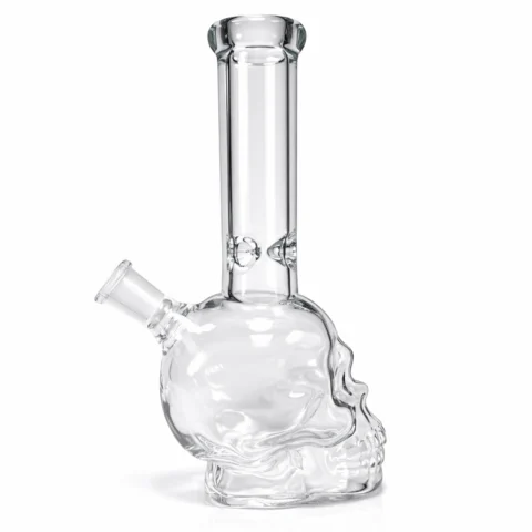 Bong de cristal con diseño artístico de calavera y acabado efecto transparente.